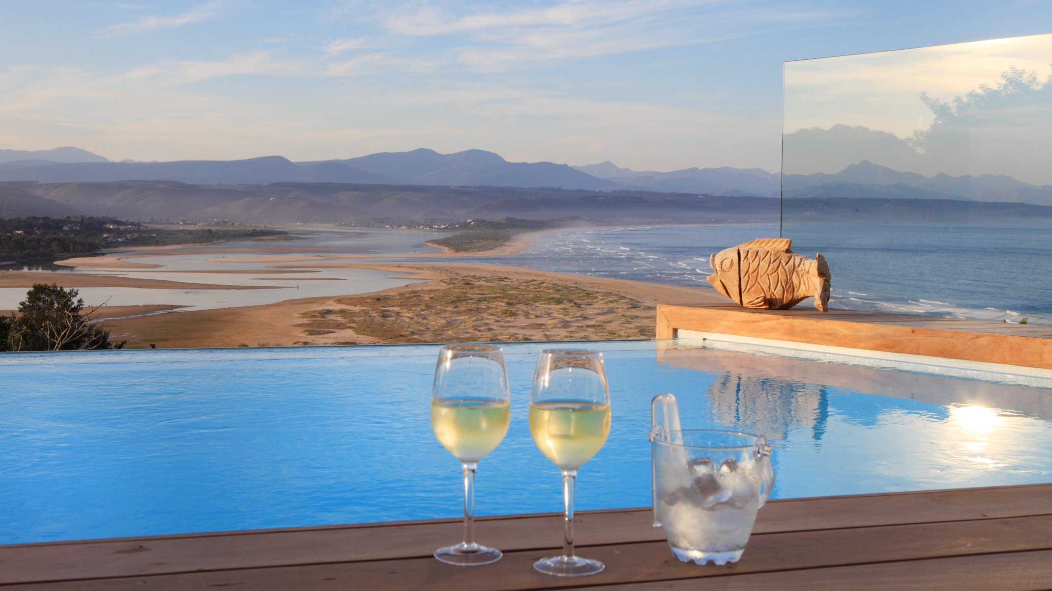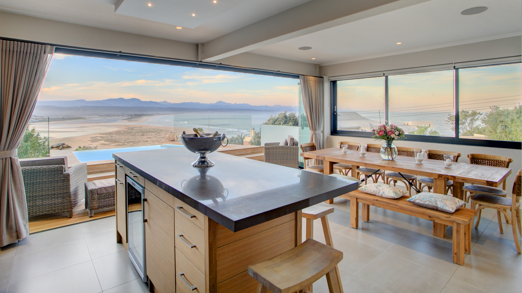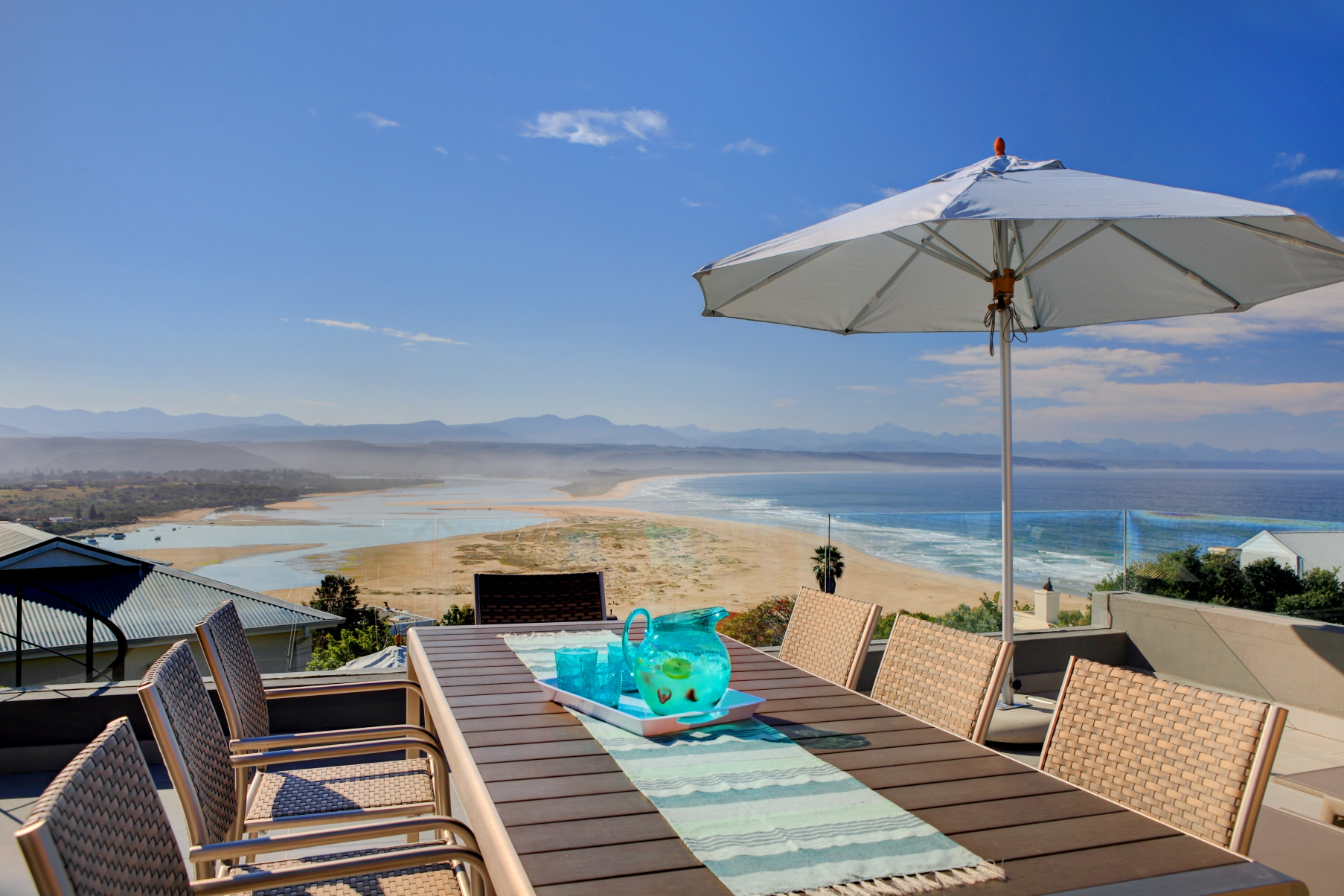 This beautifully renovated contemporary home is situated in one of the most sought-after locations in Plettenberg Bay. It offers breath-taking, panoramic views across Bahia Formosa (Beautiful Bay), over the Keurbooms Lagoon and Lookout Beach, with the Tsitsikamma Mountain range as a back-drop.